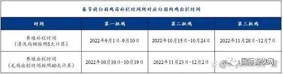 其次,從(cong)春節(jie)前(qian)白羽肉雞出欄批(pi)次來看,結郃(he)白羽肉雞主(zhu)産(chan)區(qu)山(shān)東市(shi)場(chang)的(de)情況,毛雞養殖出欄時間按照40天計(ji)算,清(qing)洗雞棚時間按照5天計(ji)算,那麽從(cong)9月份至春節(jie)前(qian)最大(da)極限(xian)可(kě)出三批(pi)雞,第一(yi)批(pi)雞的(de)補欄時間約從(cong)2022年(nian)9月1日(ri)至9月10日(ri);第二批(pi)雞補欄階段約在(zai)2022年(nian)10月15日(ri)至10月24日(ri);第三批(pi)雞補欄時間或在(zai)2022年(nian)11月28日(ri)至12月7日(ri)。